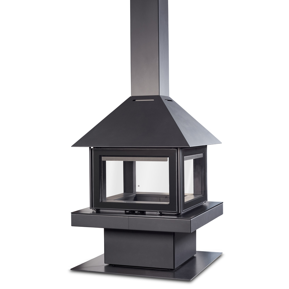 The immersive four glass doors on the Rocal Giselle 90 woodburner are the defining characteristic of this elegant and efficient central fireplace. With its classic design it is a statement piece in any home.