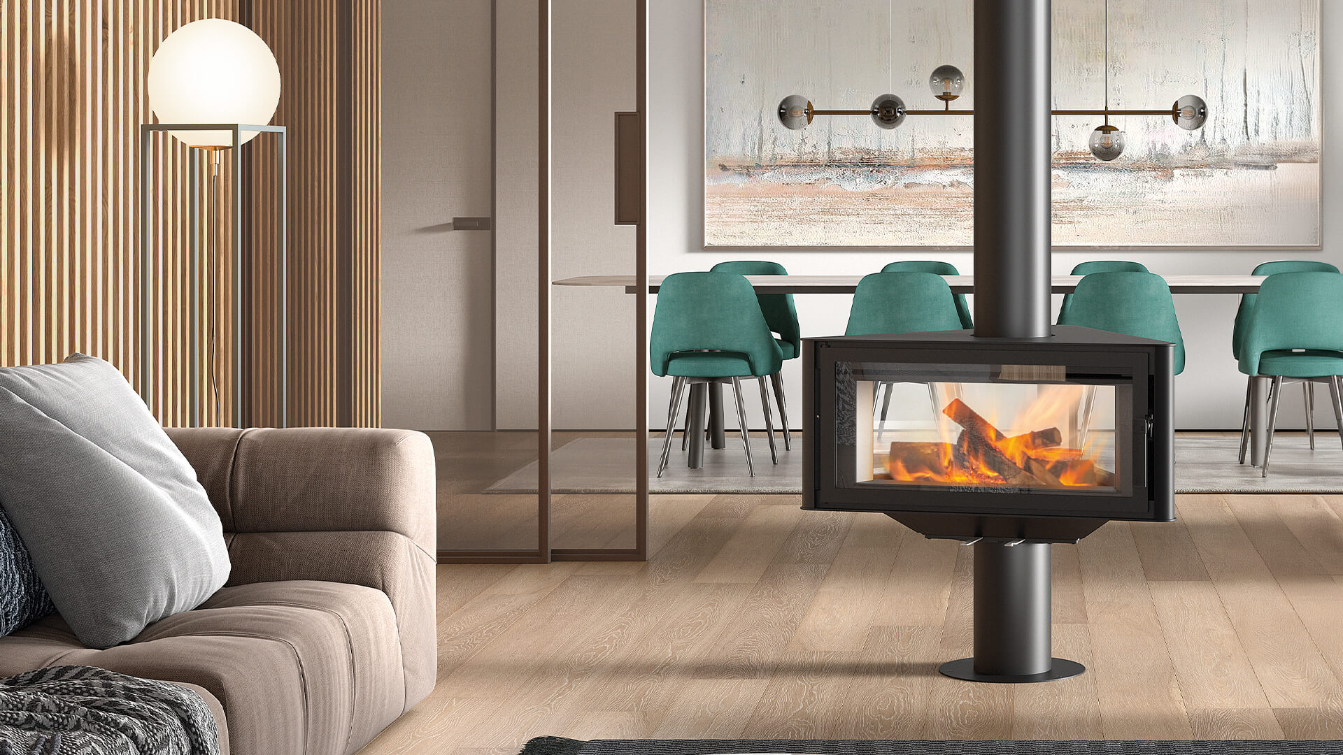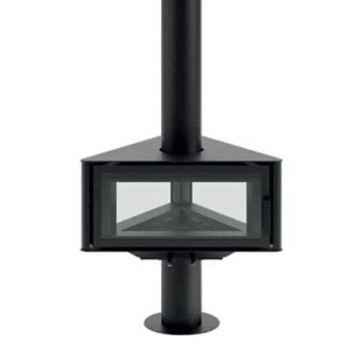 The Rocal Born wood burning stove is a unique and efficient heating solution with a stylish triangular design suited for the centre of a room.