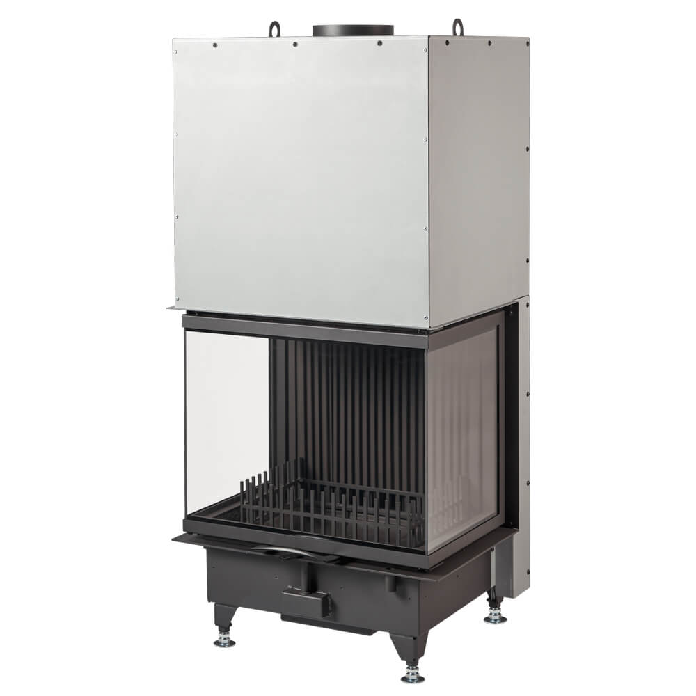 Three-sided Austroflamm Vuur Drie 60 Fireplace with lift-up door, keramott firebrick lining, and optional frames for a panoramic, efficient wood-burning experience.