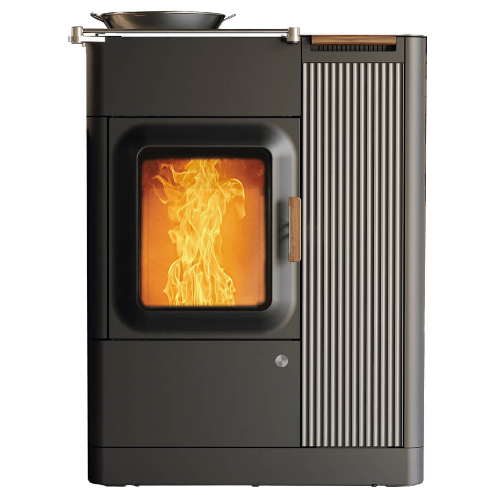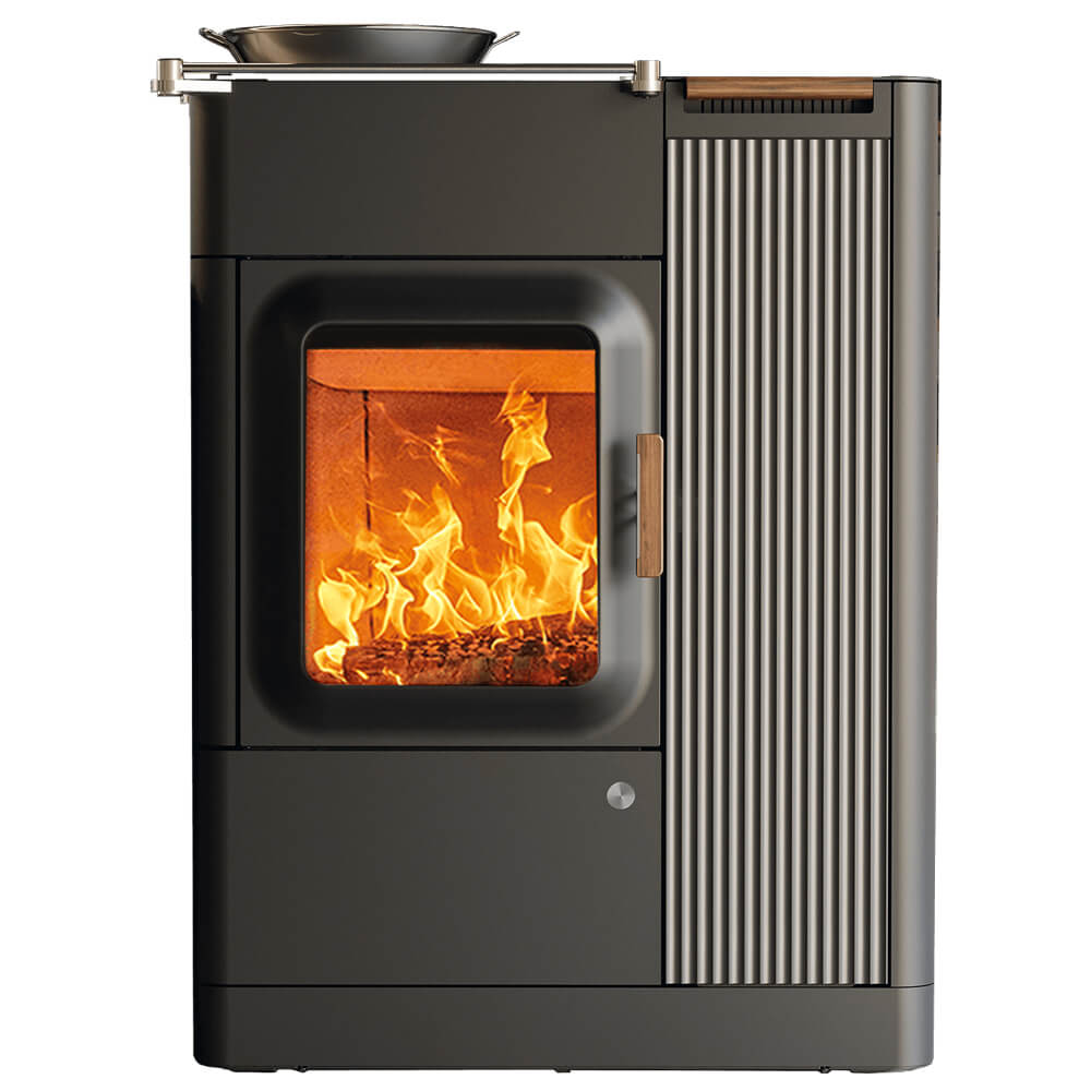 The Austroflamm Mo Duo Cook Hybrid Stove blends wood and pellet heating, featuring an integrated hot plate for cooking and eco-friendly efficiency.