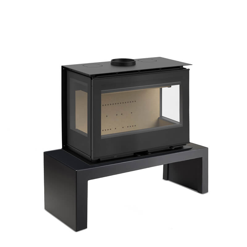 The Atria 80 TC a 3-sided wood stove that is hearth mounted as standard and can be installed with a leg set, wall bracket, logstore, or choice of stove bench.